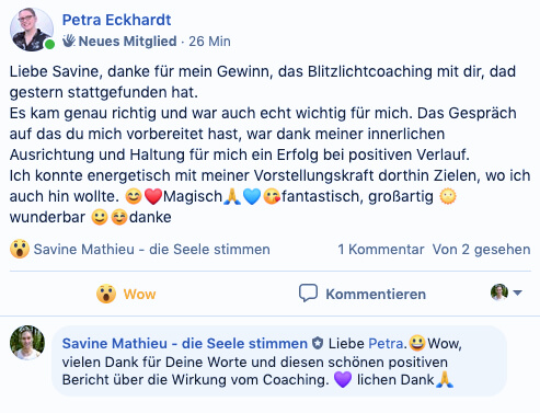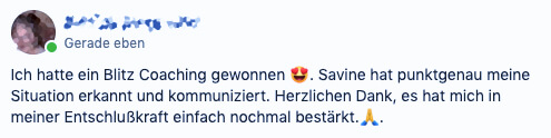 (Nur im Spezialangebot enthalten) Du erhältst live in einem ZOOM-Call ein individuelles Coaching zu einem Thema Deiner Wahl mit Savine und ihrer sehr feinfühligen intuitiven und medialen Wahrnehmung um Dir Klarheit, Entscheidungshilfen oder Techniken zu geben für Deinen aktuellen nächsten Schritt auf Deinem Entfaltungsweg.