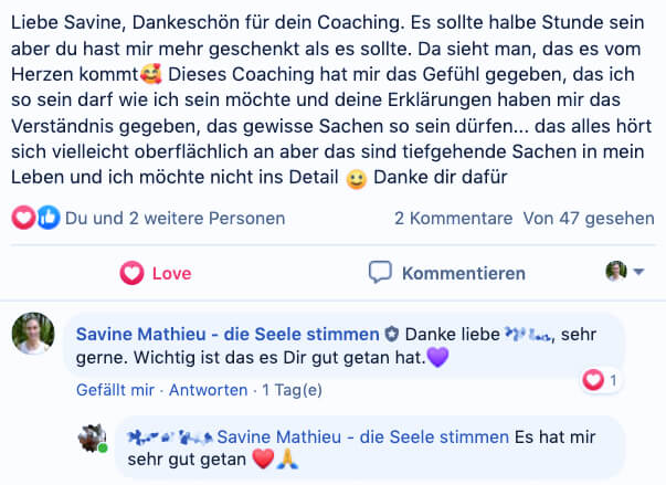 Zusätzlich erhältst Du von mir ein ganz individuelles 1:1 Coaching, wo Du Dein wichtigstes Seelen-Bedürfnis ausdrücken kannst und wir Wege besprechen, um Erfüllung für Deine Wünsche zu finden.